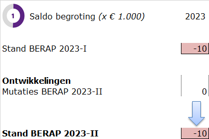 In onderstaand overzicht is het verloop van knop 1 saldo begroting zichtbaar. Het beginpunt is de stand van de BERAP 2023-I. Deze BERAP bevat geen structurele mutaties en zodoende blijft het saldo gelijk.
